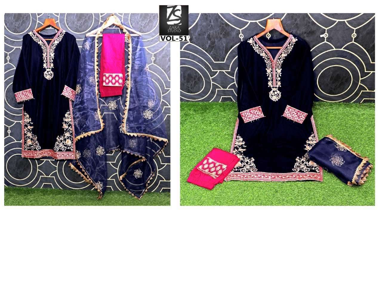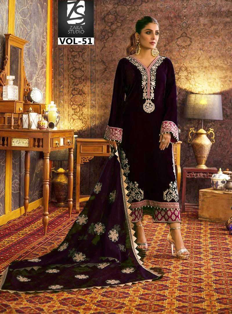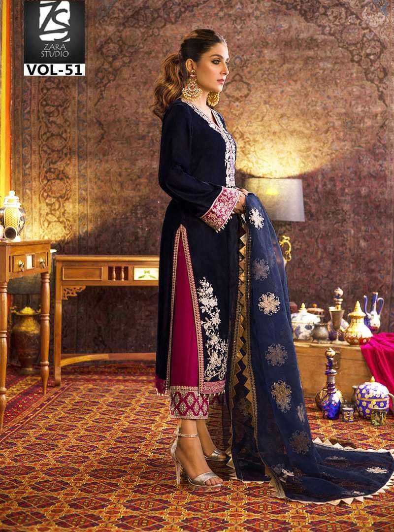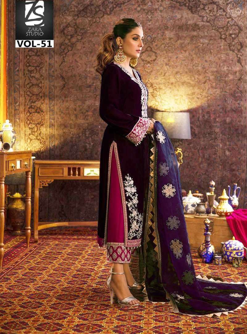 ZARA STUDIO VOL-51 DESIGNER WITH WORK PAKISTANI STYLE VELVET TOP WITH PANT AND DUPATTA ARE AVAILABLE AT WHOLESALE PRICE