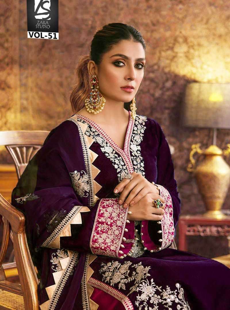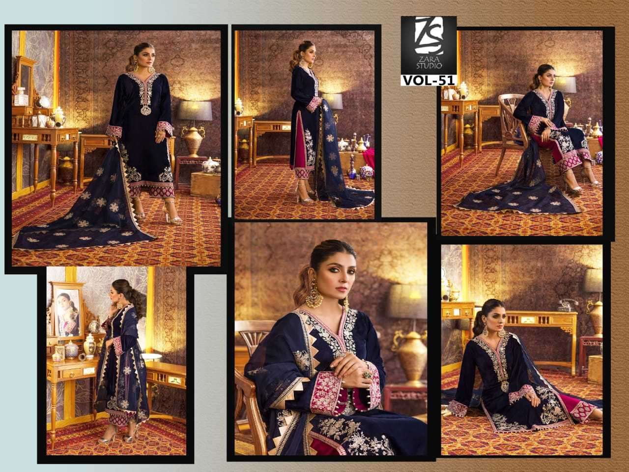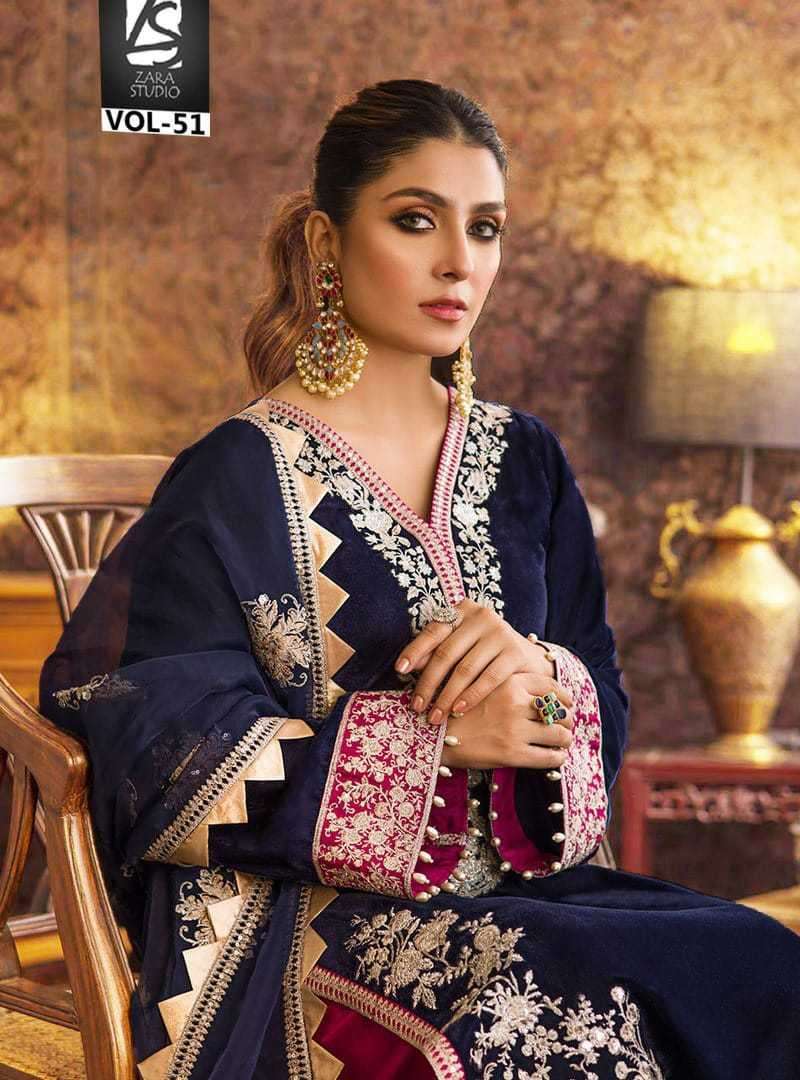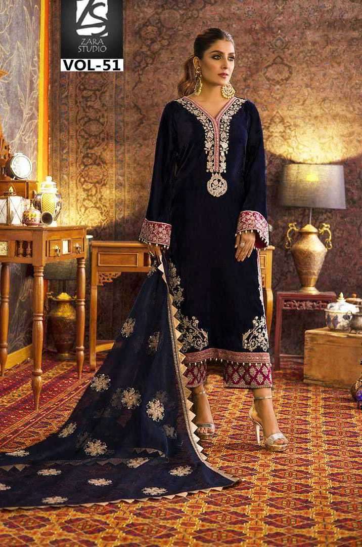 ZARA STUDIO VOL-51 DESIGNER WITH WORK PAKISTANI STYLE VELVET TOP WITH PANT AND DUPATTA ARE AVAILABLE AT WHOLESALE PRICE