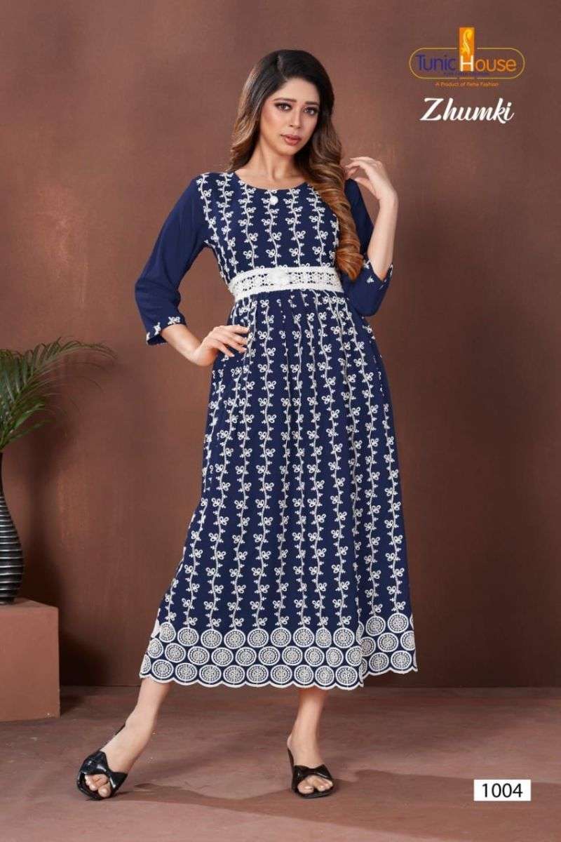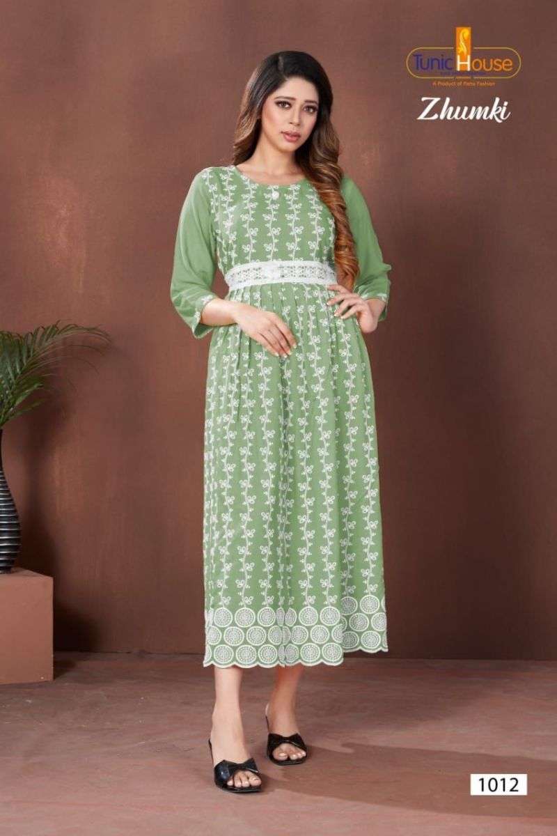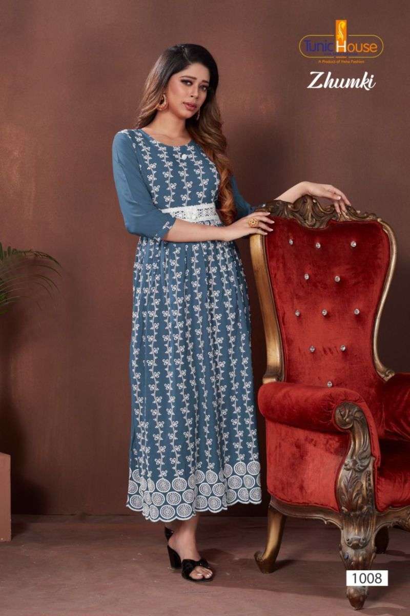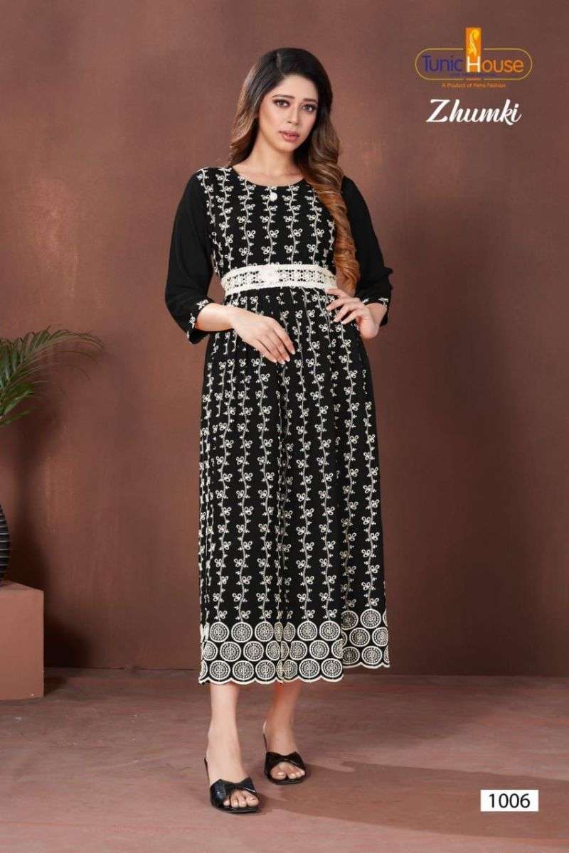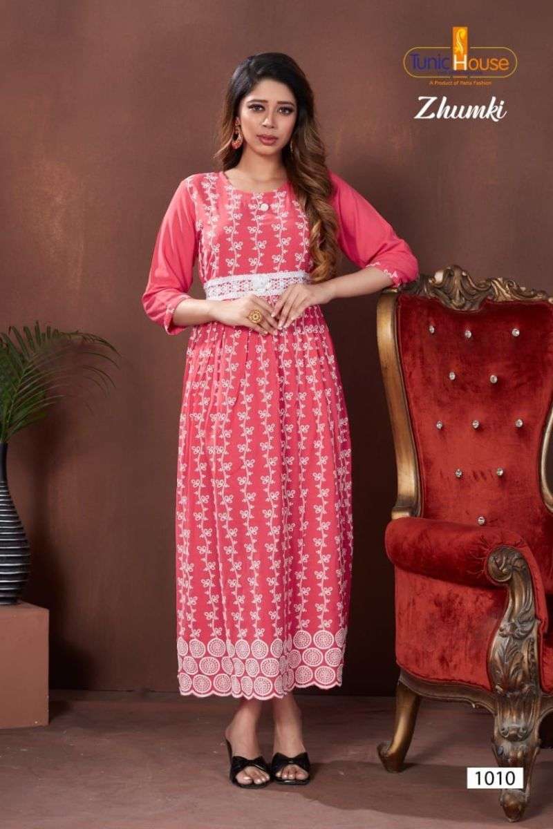 ZHUMKI KURTI BY TUNIC HOUSE DESIGNER WITH LUCKNOWI WORK VISCOSE RAYON KURTIS ARE AVAILABLE AT WHOLESALE PRICE