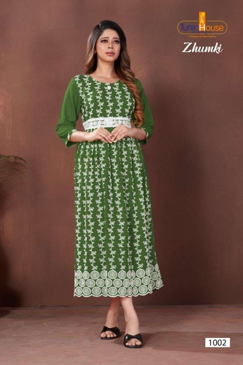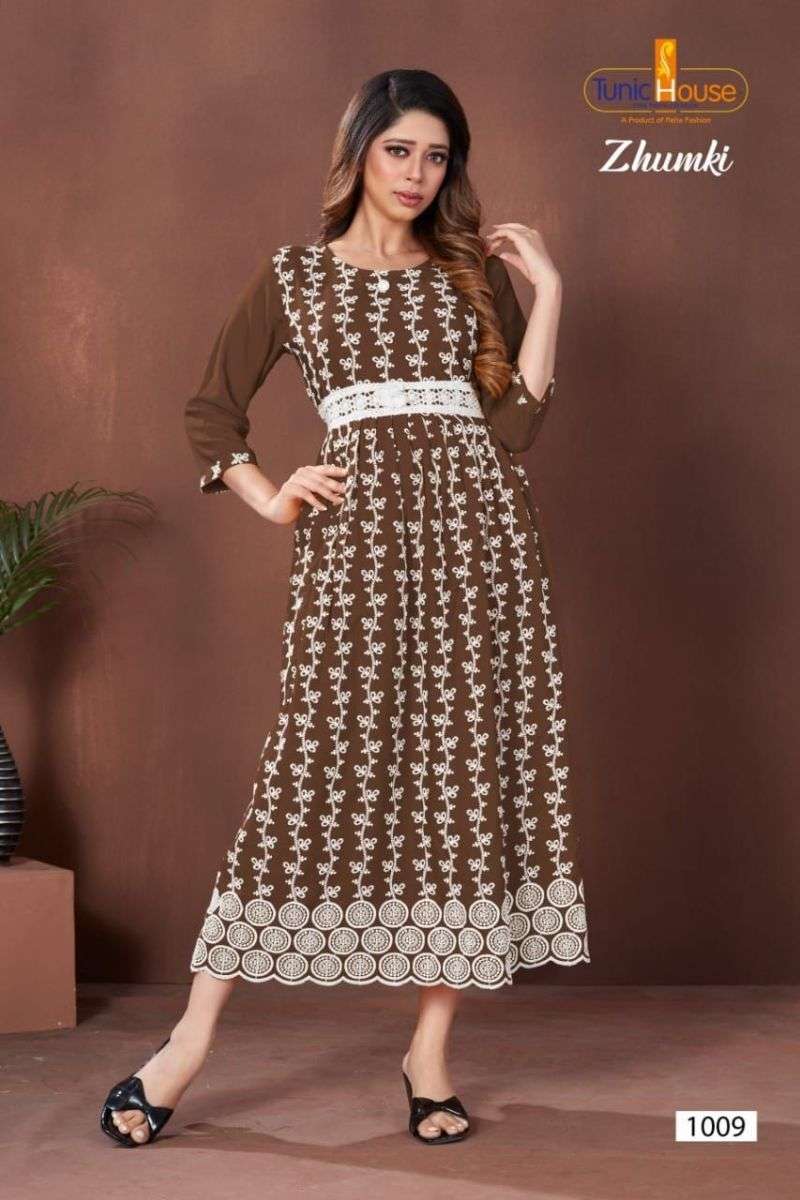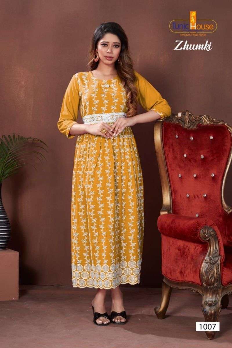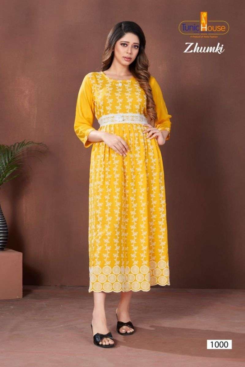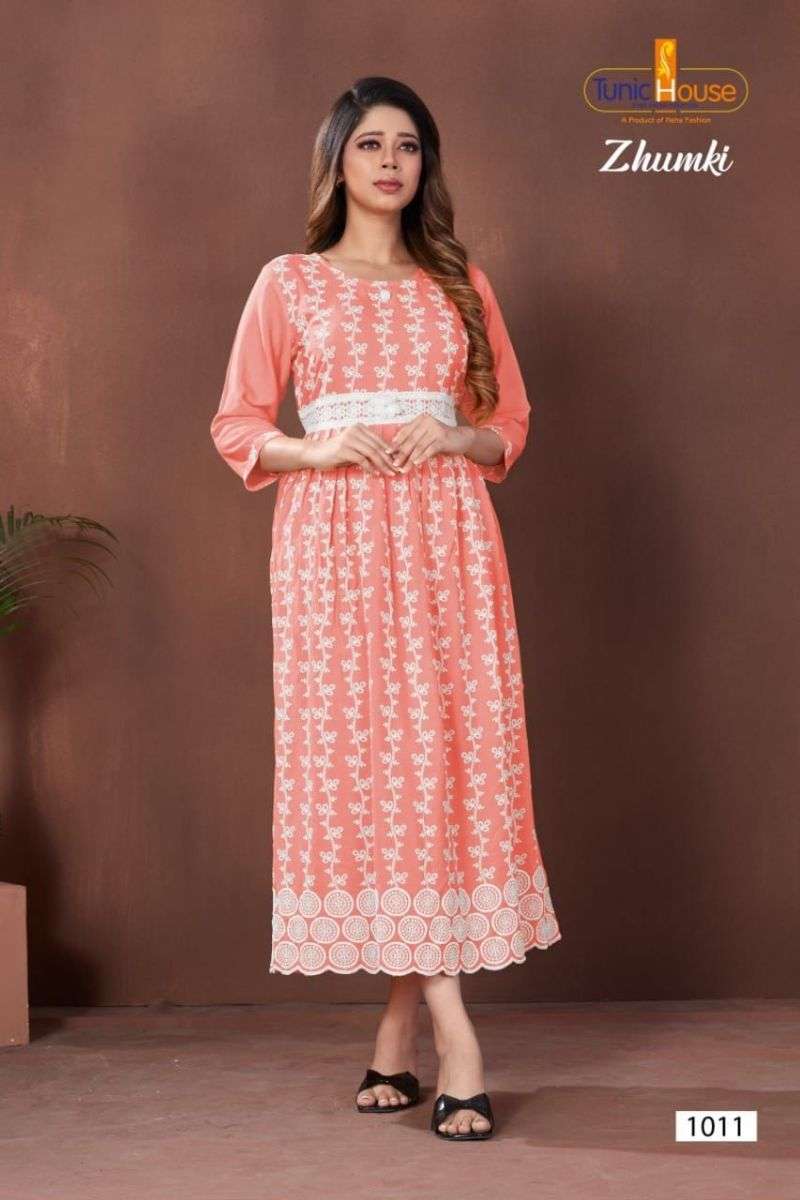 ZHUMKI KURTI BY TUNIC HOUSE DESIGNER WITH LUCKNOWI WORK VISCOSE RAYON KURTIS ARE AVAILABLE AT WHOLESALE PRICE